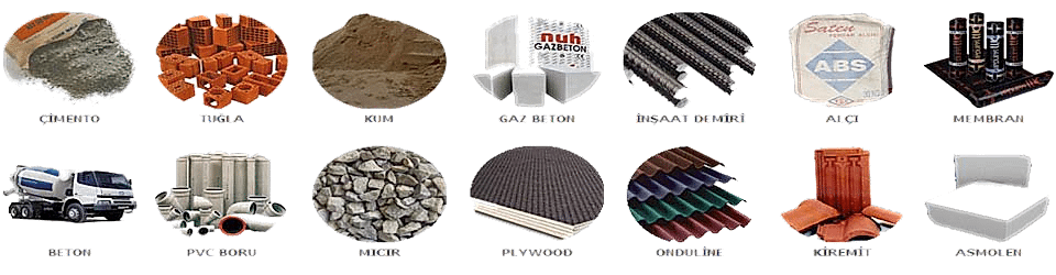 Drenaj Levhası, Membran, Ytong, Multipor, İnşaat Demiri, Çelik Hasır, Beton, Kum ve Çakıl, Tuğla Çeşitleri, İzobims Tuğla, Nuh Gazbeton, Lento Ytong, Kiremit ve Çatı Sistemleri, Renkli Çatılar, Shingle Çatı Malzemeleri, OSB, Asmolen Köpük Tuğla, Asmolen Tuğla, Dekor Tuğla Çeşitleri, Hazır Sıva, Alçı Çeşitleri ve Alçı Panelleri, Alçı Levhaları, Profil, Çimento, Kireç, Tesviye Harçları, Yapı Kimyasalları, Fayans Yapıştırıcıları, Dış Cephe Mantolama Malzemeleri, XPS Köpük Levha, EPS Köpük Levha, Söve - Dekoratif Dış Cephe, Membran Su Yalıtımı, Sürme Su Yalıtım Elemanları